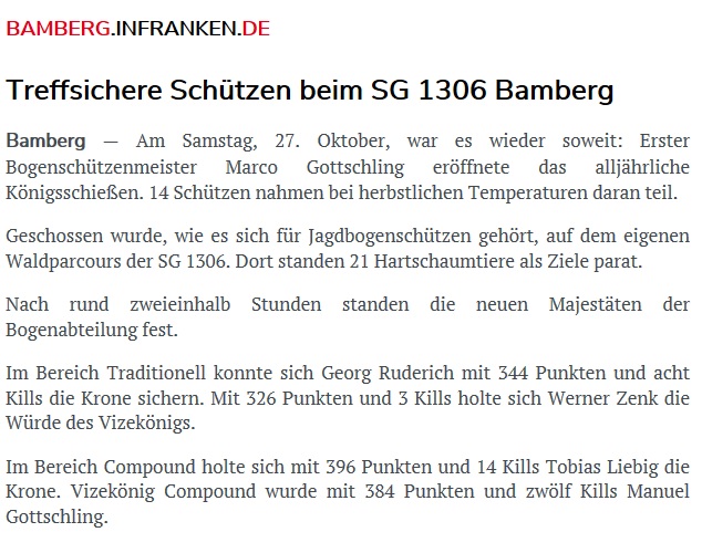 Die Schützengesellschaft 1306 Bamberg hat eine tolle Bogenabteilung und betreibt einen eigenen 3 D Parcours, der allen Vereinsmitgliedern zur Verfügung steht. Das Jagdbogenturnier der Bamberger Bogenschützen ist bis weit über die Bayerischen Grenzen hinaus bekannt. Um hier einen Platz zu bekommen muß man sich rechtzeitig anmelden.